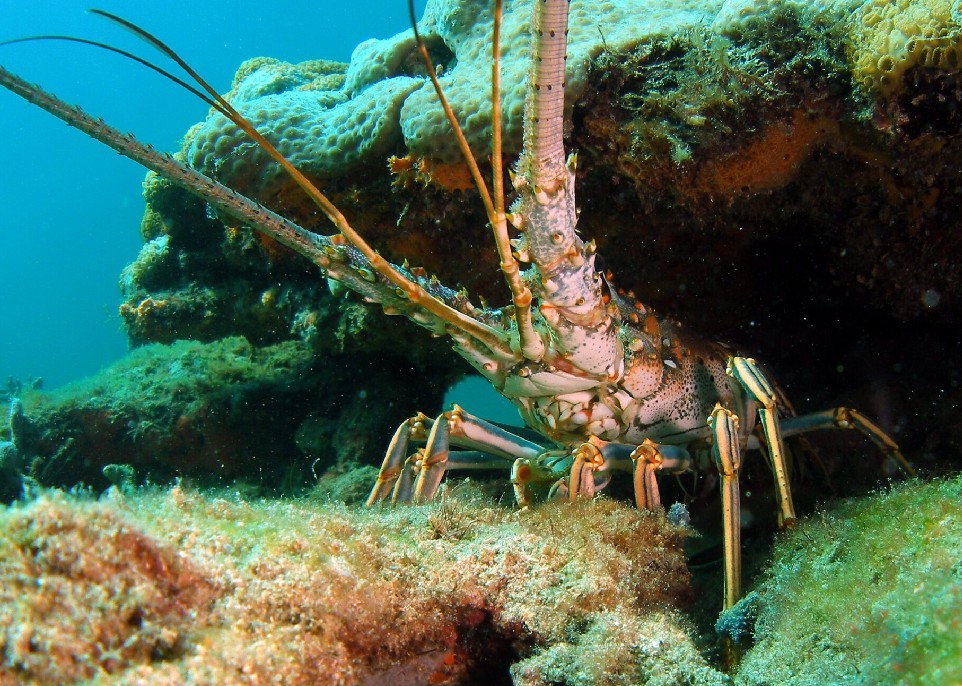 A lobster hangs out under some coral beneath the Atlantic Ocean